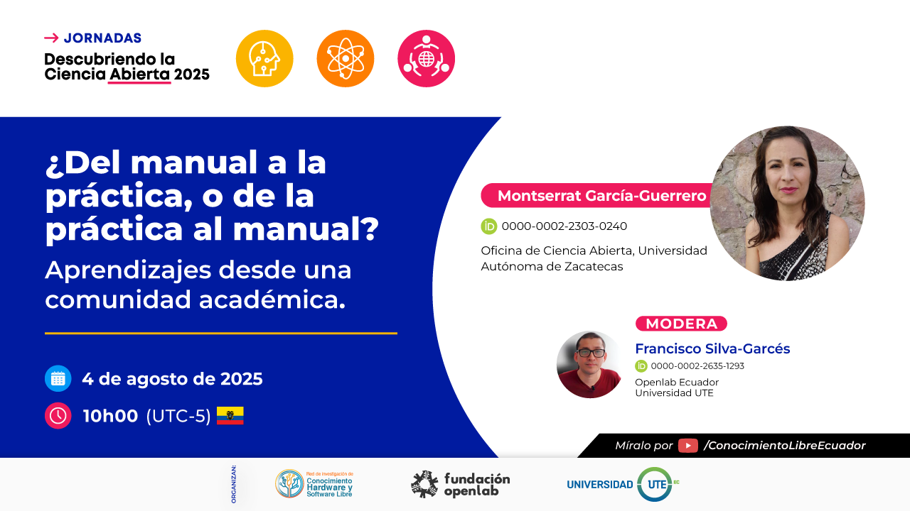 En esta sesión de Descubriendo la Ciencia Abierta conversaremos con Montserrat García, coordinadora del Manual de Ciencia Abierta, sobre el camino de ida y vuelta entre la construcción colectiva de un recurso de referencia y la implementación concreta de prácticas de ciencia abierta en la Universidad Autónoma de Zacatecas. A través de su experiencia al frente de la Oficina de Ciencia Abierta, conoceremos cómo se articula el trabajo con la comunidad académica, los retos de llevar la apertura a la vida universitaria y los aprendizajes que surgen de este proceso de transformación cultural.