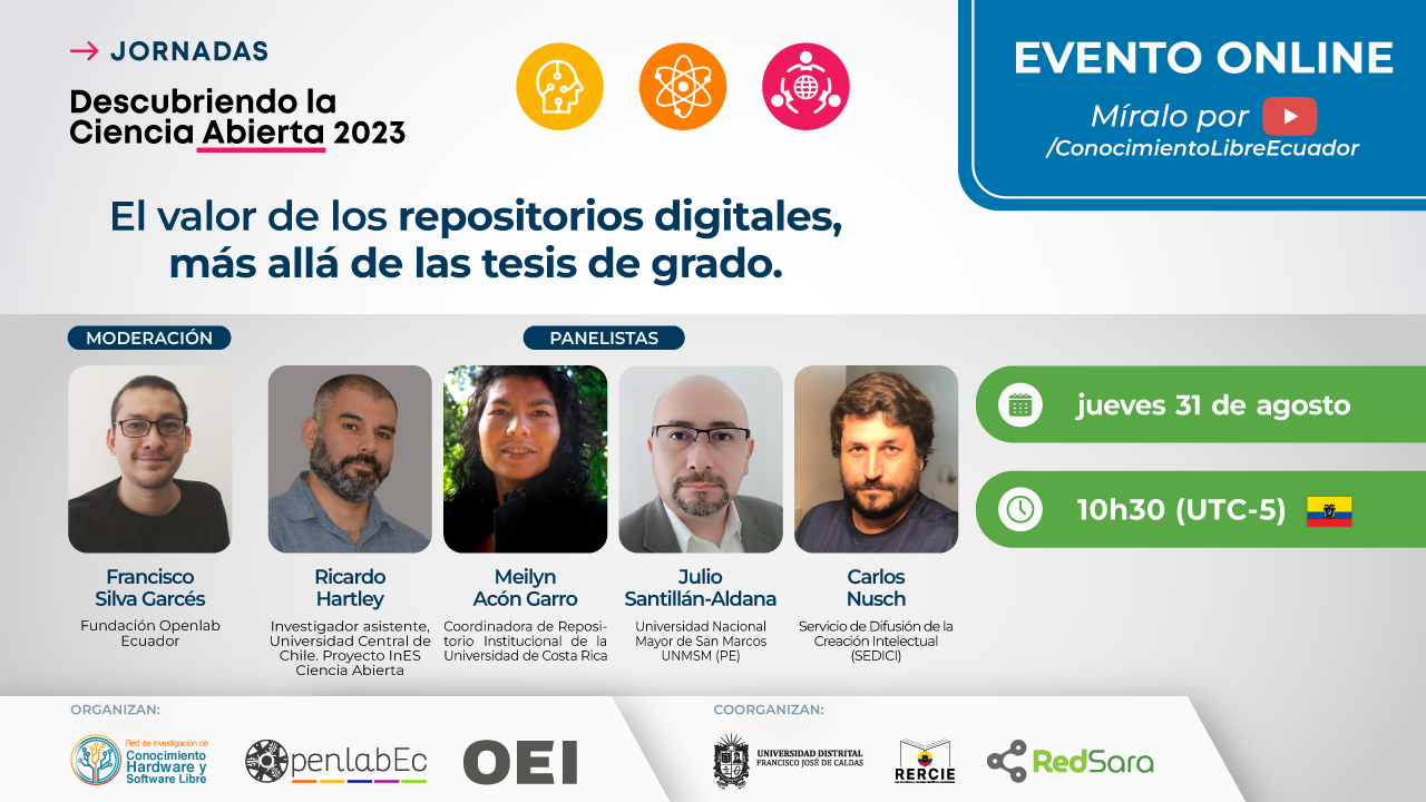 En este conversatorio, nuestros invitados contarán experiencias en sus países, y nos harán recomendaciones acerca del uso potencial de estas infraestructuras para implementar prácticas de ciencia abierta.