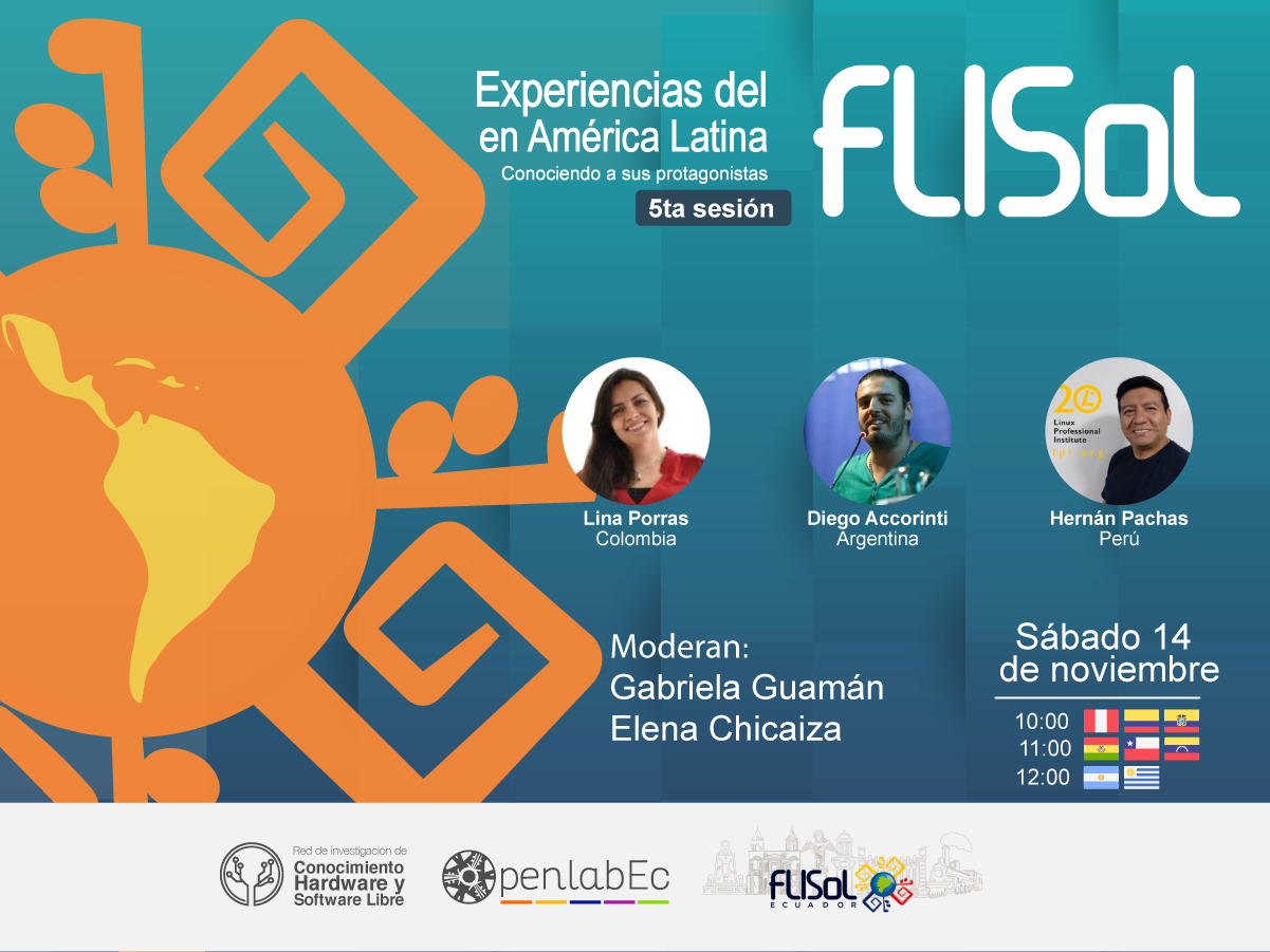 Experiencias de FLISoL en América Latina es una iniciativa de los organizadores del FLISoL 2020 Ecuador edición EnLinea y la Red de Investigación de Conocimiento, Software y Harware Libre con el apoyo del Laboratorio Ciudadano de Tecnologías y Cultura Libre Openlab Ecuador, al que se están sumando organizadoras/es de FLISoL de la región.