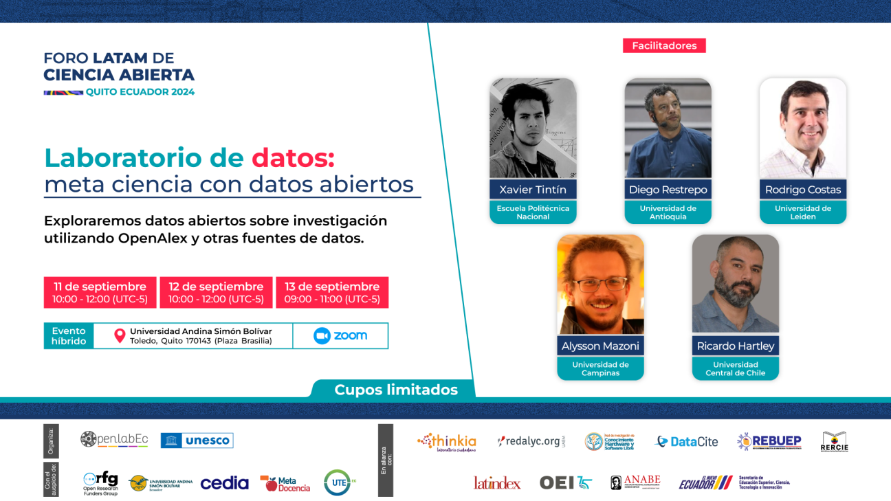 Bienvenidos al Laboratorio de Datos: Cienciometría y datos abiertos, un evento de tres días diseñado para fomentar la colaboración y la creatividad en el ámbito de los datos abiertos sobre investigación. Este encuentro es una oportunidad para aprender, crear y colaborar en proyectos innovadores que promuevan el uso y la reutilización de datos abiertos.