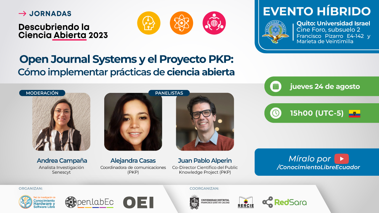 Continuan las Jornadas Descubriendo la Ciencia Abierta 2023, en esta primera sesión de segundo ciclo, Alejandra Casas y Juan Pablo Alperín nos contarán sobre el Proyecto Public Knowledge Project (PKP) y unas de las insignias en el mundo de las infraestructuras digitales para la ciencia abierta, Open Journal System (OJS). Cómo implementar prácticas de ciencia abierta, más allá de la publicación científica.