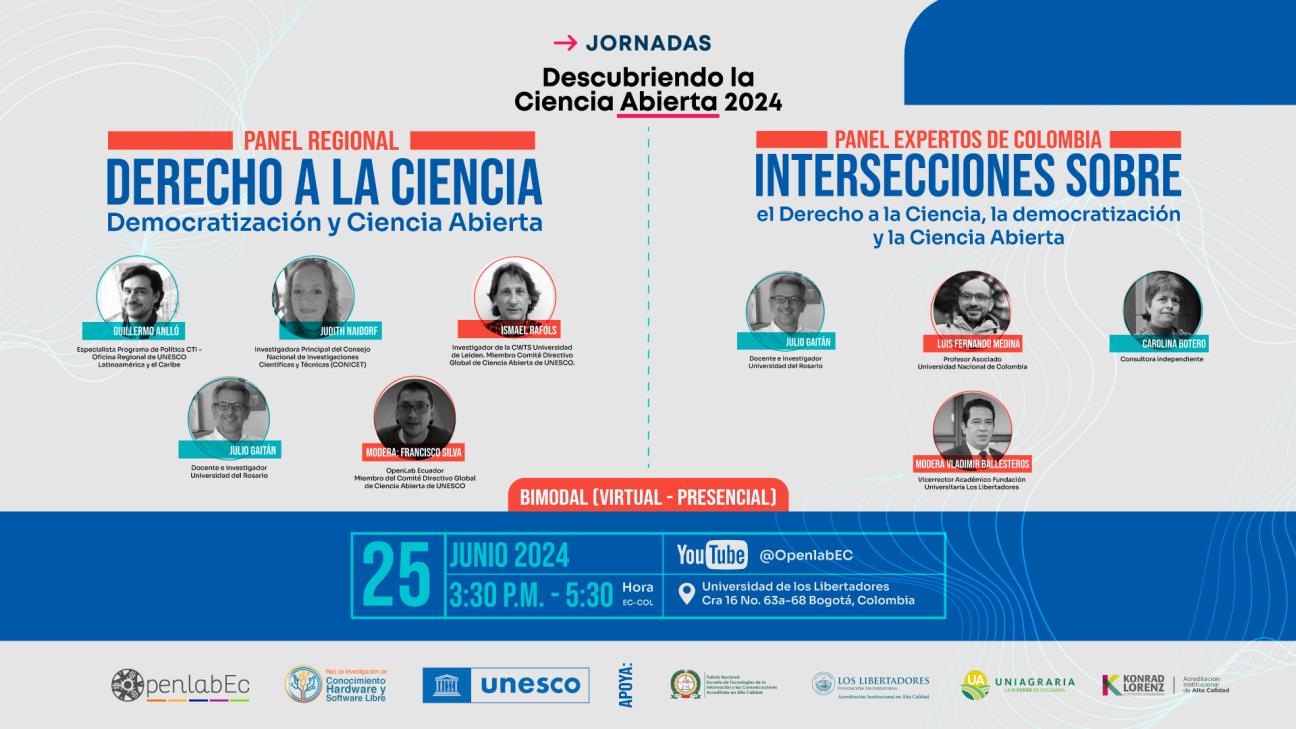 2 paneles regionales en los que abordaremos el Derecho a la Ciencia: Democratización y Ciencia Abierta y finalmente hablaremos de las Intersecciones sobre el Derecho a la ciencia, la democratización y la ciencia abierta. Nuestros invitados e invitadas son activistas experimentados que compartirán sus reflexiones en torno a la Ciencia como derecho y su aplicación hecha posible por medio de la Ciencia Abierta.