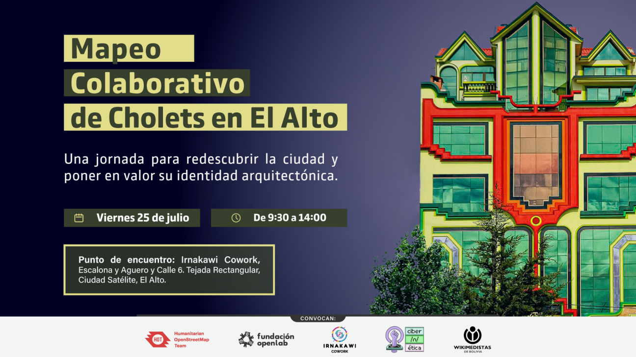 A través del uso de herramientas libres y el trabajo en equipo, construiremos un Mapa Abierto de Cholets de El Alto, disponible públicamente para fines educativos, turísticos y patrimoniales.